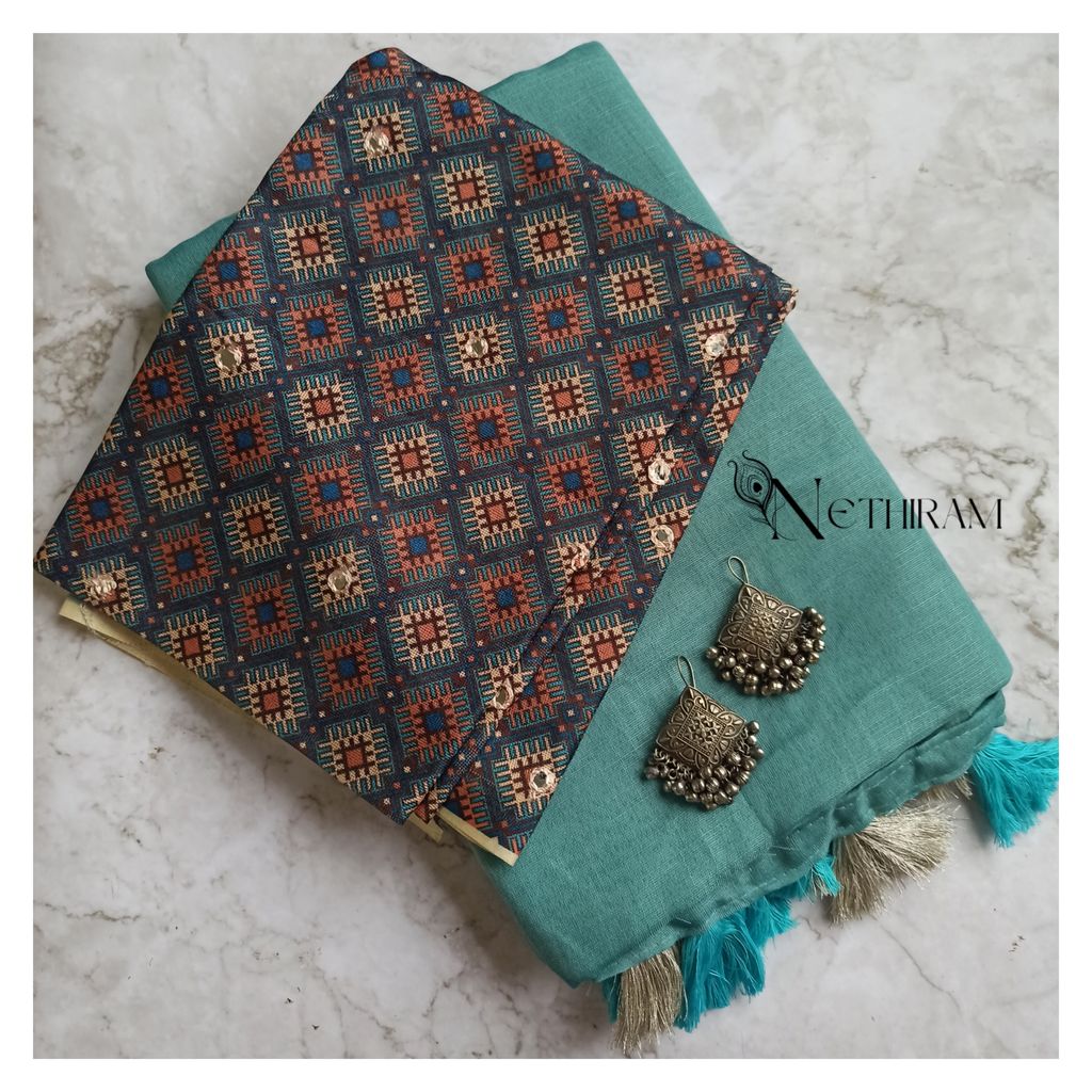 Digitally printed jute silk with mirror work as in image