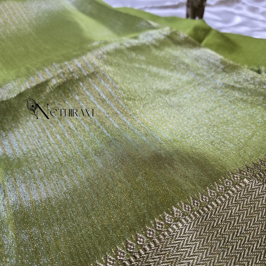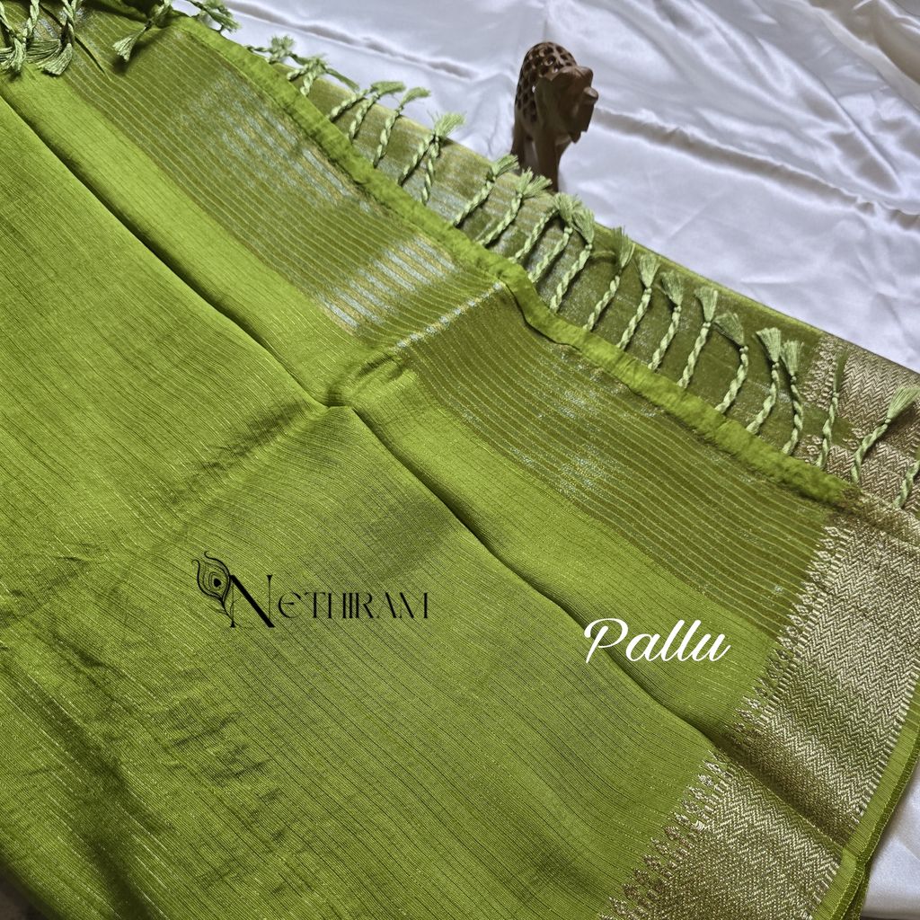 Vibrant Green Tissue Silk Saree with Zari Border & Tassels